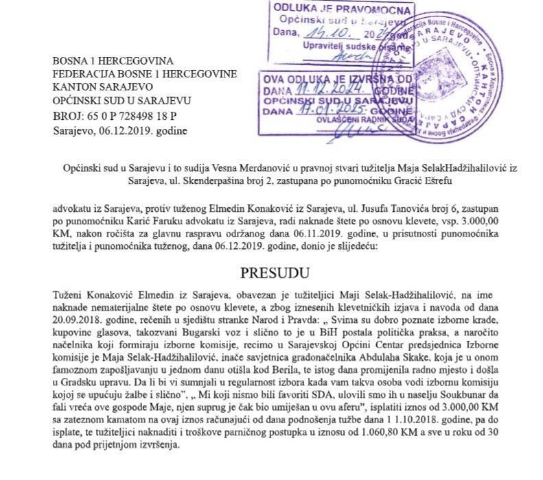 Podsjećamo, Općinski sud u Sarajevu (sutkinja Vesna Merdanović) je 6. decembra 2019. godine presudio da je Elmedin Konaković počinio klevetu na štetu Maje Selak-Hadžihalilović (danas Maje Hadžihalilović) zbog izjava od 20. septembra 2018. godine, u kojima ju je dovodio u vezu s neregularnostima u izbornom procesu.