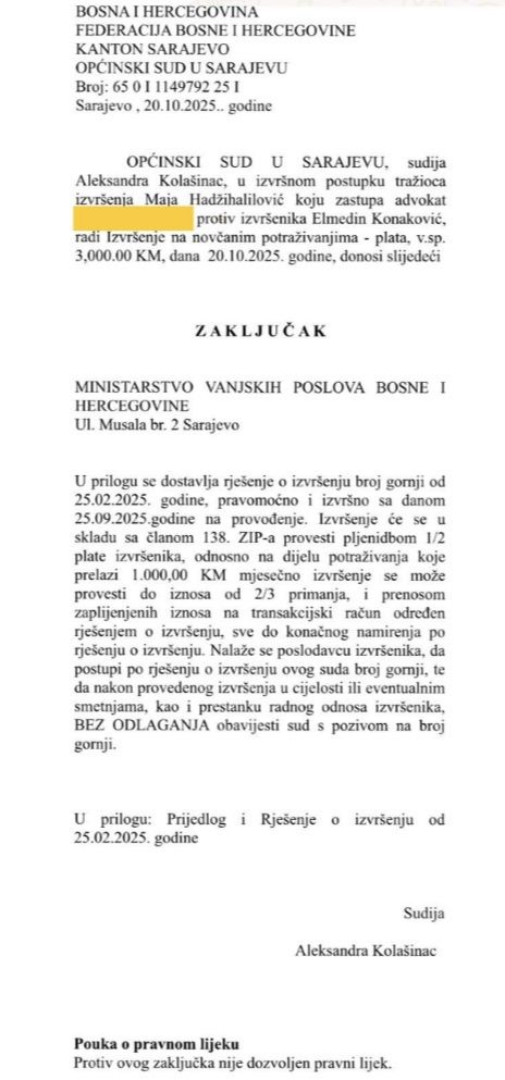 Općinski sud u Sarajevu donio je odluku kojom se nalaže provođenje izvršenja na novčanim potraživanjima ministra vanjskih poslova BiH Elmedina Konakovića, radi prisilne naplate 3.000 KM dosuđenih po pravosnažnoj presudi zbog klevete na štetu Maje Hadžihalilović, uz zateznu kamatu i parnične troškove u iznosu od 1.060,80 KM.
